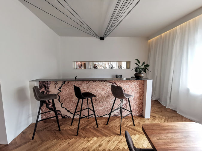Es wurde ein Farb-, Material- und Ausstattungskonzept entwickelt, was die bestehenden wertvollen Elemente mit moderner Anmutung kombiniert. In Zusammenarbeit mit Fotograf Ralf Uhler wurden große Wandgrafiken entwickelt, die sowohl akustische, energetische und gestalterische Funktion haben. Das Loft wurde mit allen Features ausgestattet, die es zu einem außergewöhnlichen Seminarraum machen.